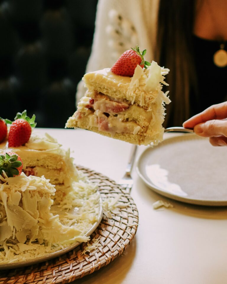Camadas de pão de ló branco, recheada com o nosso maravilhoso creme de leite condensado e morangos frescos. Finalizada com creme de leite condensado, raspas de chocolate branco e morangos. Leve, cremosa e sofisticada.