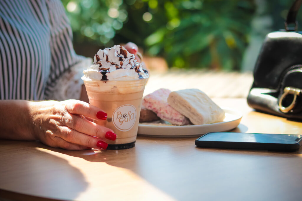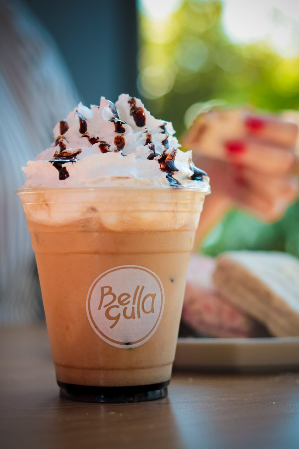 Cappuccino, leite vaporizado, espresso e calda de chocolate. Coberto com chantilly cremoso e mais calda de chocolate.