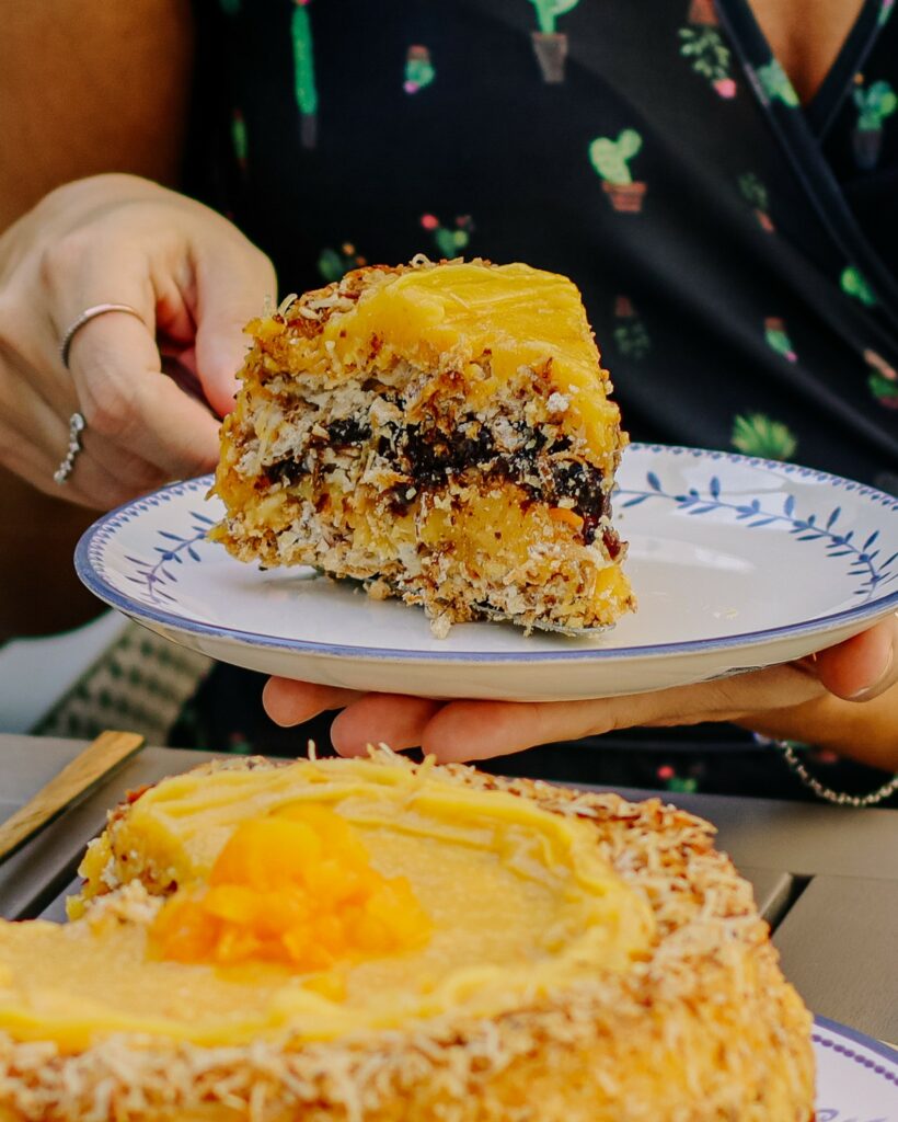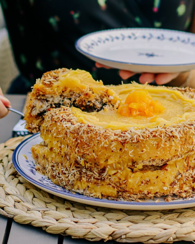 Uma deliciosa combinação de discos de coco tostados, cremoso doce de ovos e creme de ameixas, coberta por um delicado creme de damasco e coco tostado. Equilibrada, sofisticada e perfeita para momentos especiais.
