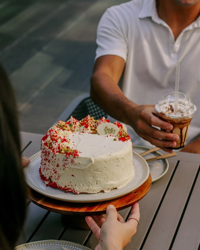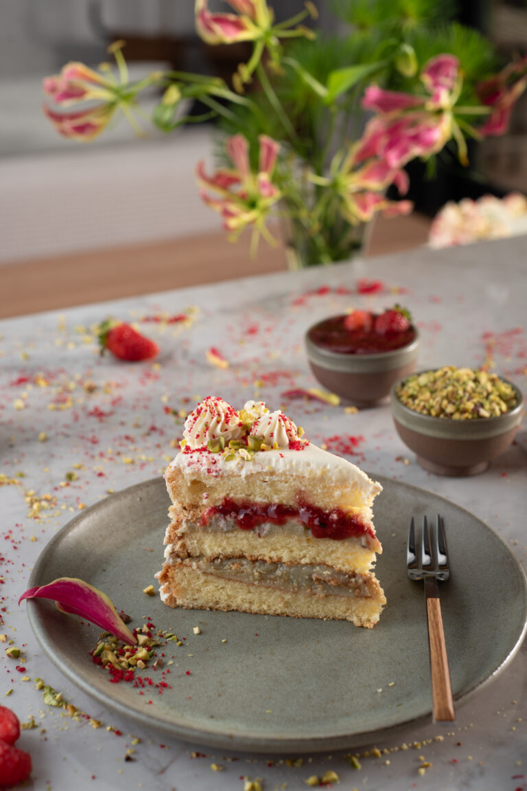 Pão de ló branco, recheado com brigadeiro de pistache cremoso, praliné de nuts crocantes e calda de frutas vermelhas. Finalizada com um delicado creme de chocolate branco e cream cheese, essa torta traz um equilíbrio perfeito entre intensidade e frescor.
