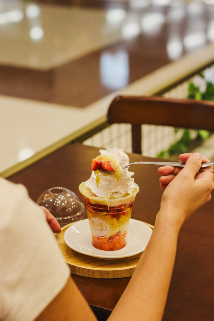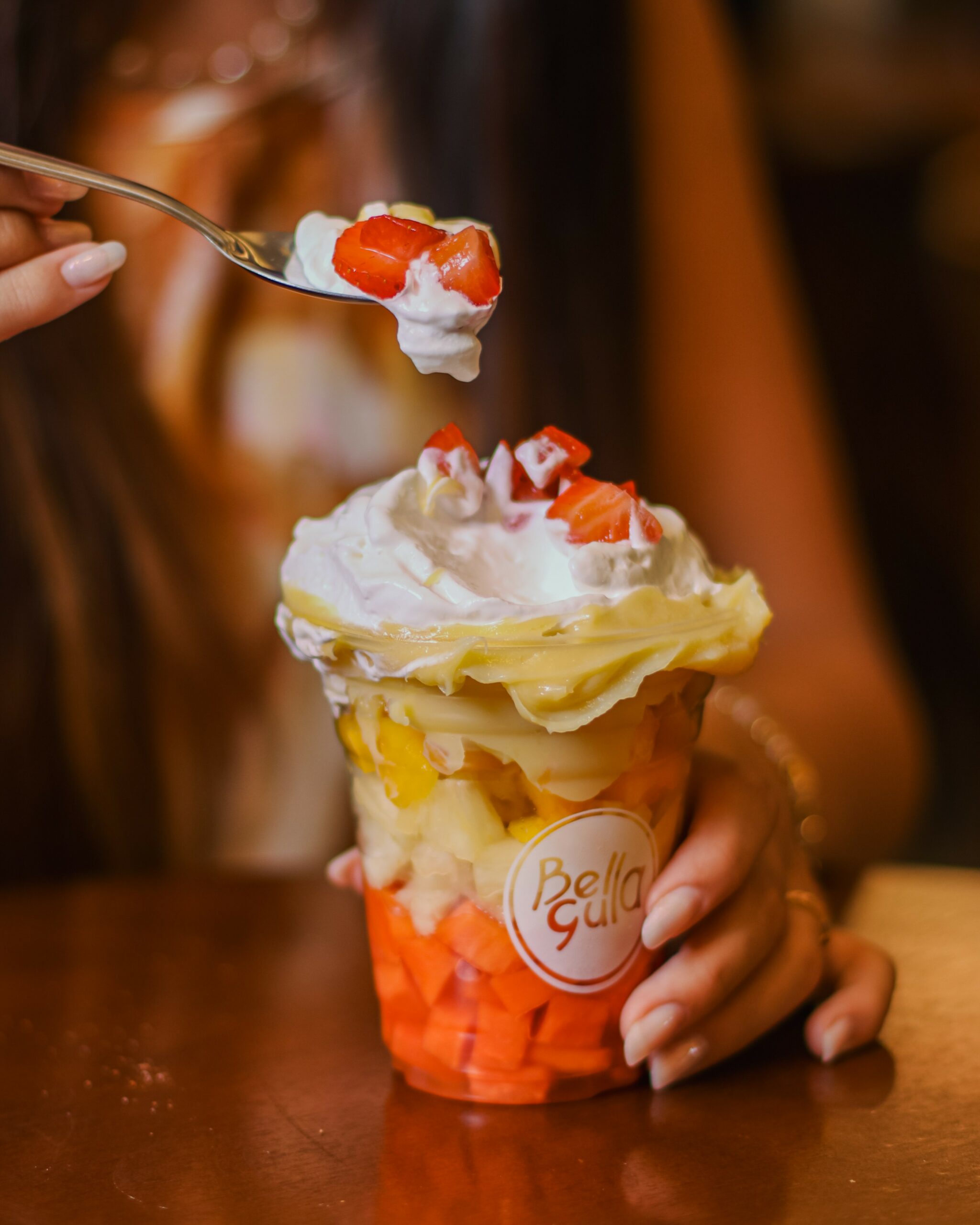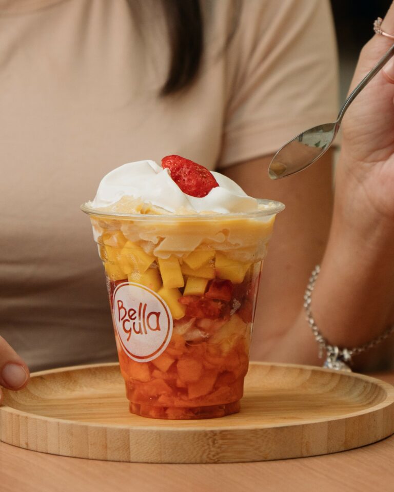 Refrescante salada de frutas com mamão, abacaxi, morango e manga em pedaços. Coberta com uma deliciosa camada de creme de leite condensado e chantilly.