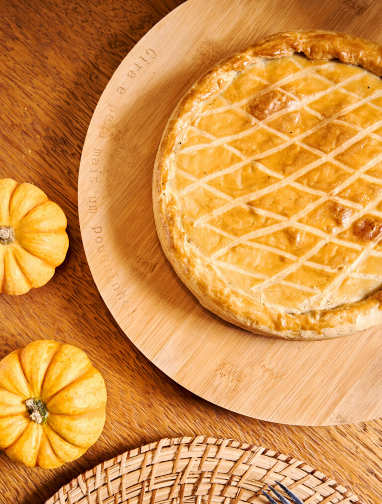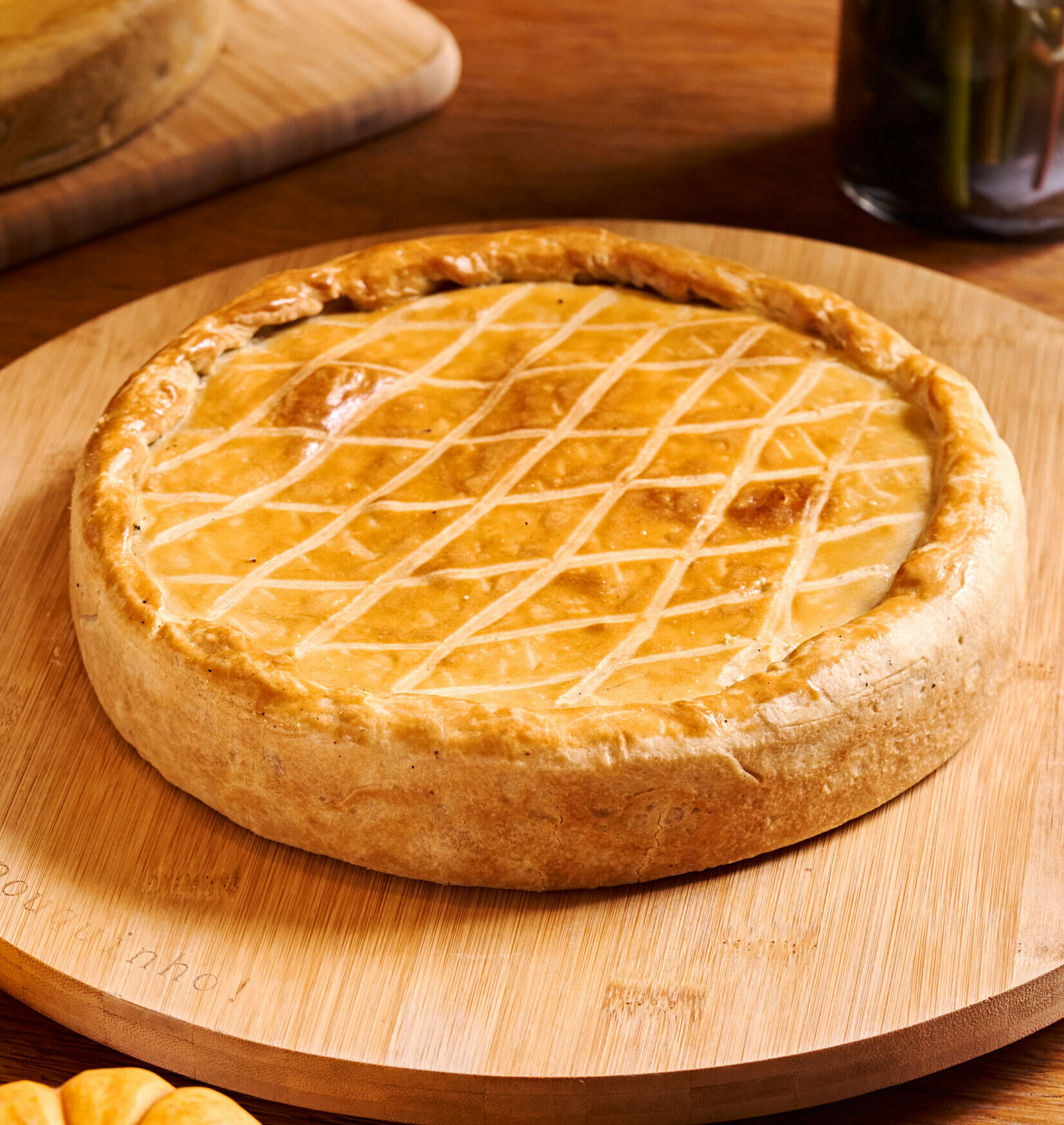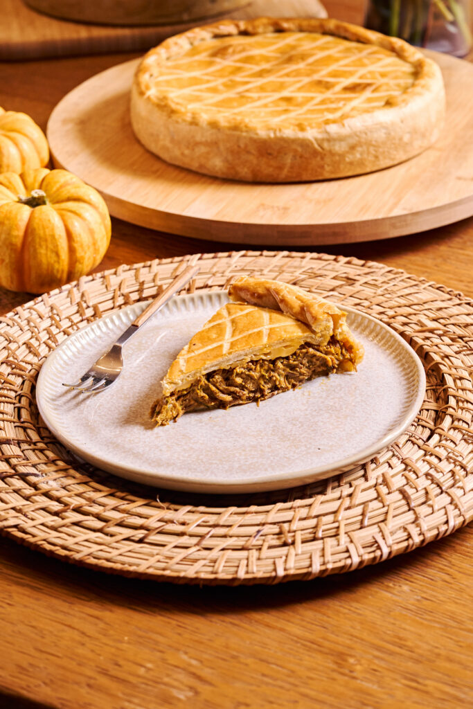 Torta recheada com a nossa deliciosa carne de panela desfiada, tempero especial e vinho tinto. Finalizada com purê de moranga e queijo colonial. Textura aveludada e intensa em sabores.